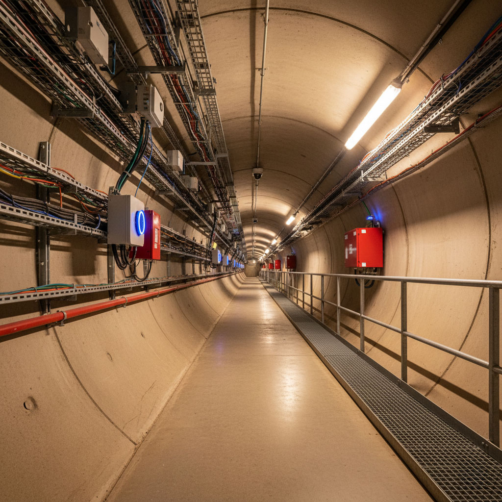 In einem 20 000 m langen Tunnel mit Ø 2 600 mm bot HADES umfassende Module wie Kommunikation & Datennetzwerk, TBM-Anbindung, Notfallkommunikation, Videoüberwachung, Zugangskontrolle, Brandmeldesystem, RTLS, WLAN und mobile Telefonie als integrierte Lösung. Die Besonderheit war die enorme Länge und Komplexität kombiniert mit hohen Sicherheitsanforderungen, Echtzeitortung und multidimensionaler Überwachung über große Distanzen. HADES fungierte hier als redundantes Backbone, das sämtliche Sprach-, Daten-, Video- und Sensorsysteme in einem hochverfügbaren, latenzarmen Netz integrierte – und so eine verlässliche untertägige Verbindung sicherstellte.